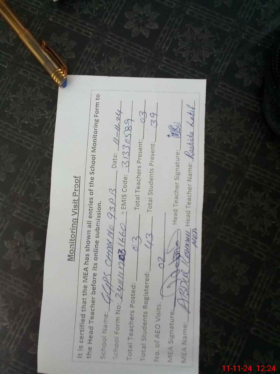 | Attendance Register | Head Teacher | MEA with School | Visit Proof |