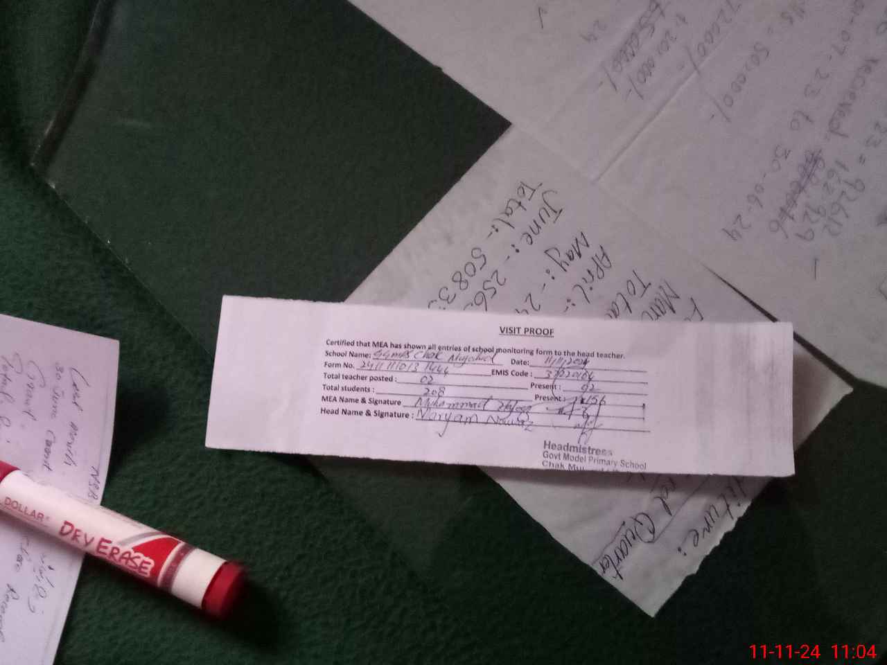 | Remarks (Use Separate Page if Required): Sir GGMPS Chak Mujahid 37220164 NSB record not complete FTF record not complete Students attendance register of class 1 and ECE not complete Give fake presence of students according the Head teacher Maryam Nawaz 182 students present but according Head count 154 present | |||||