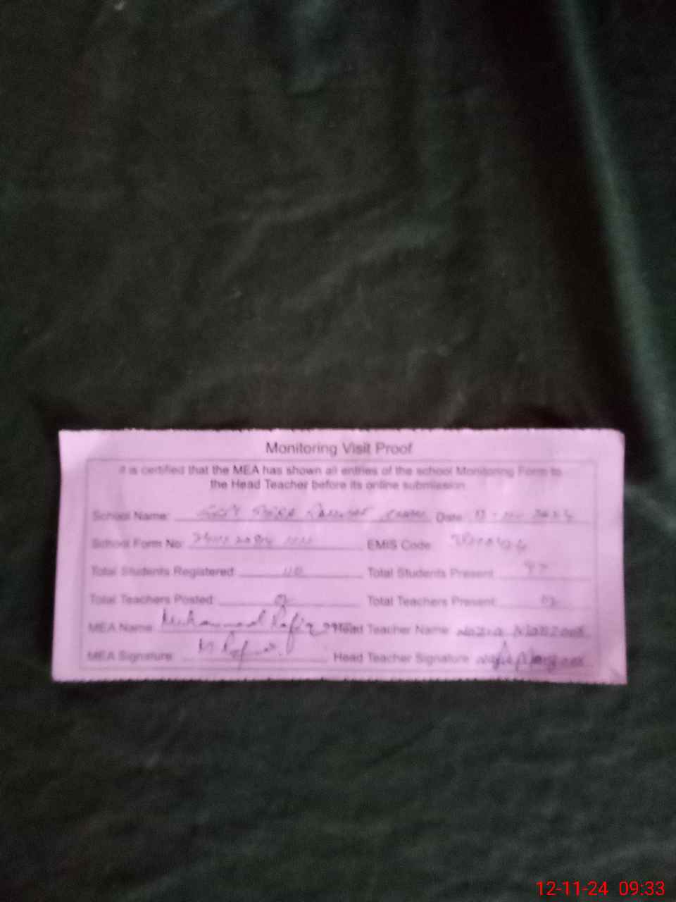 | Attendance Register | Head Teacher | MEA with School | Visit Proof |