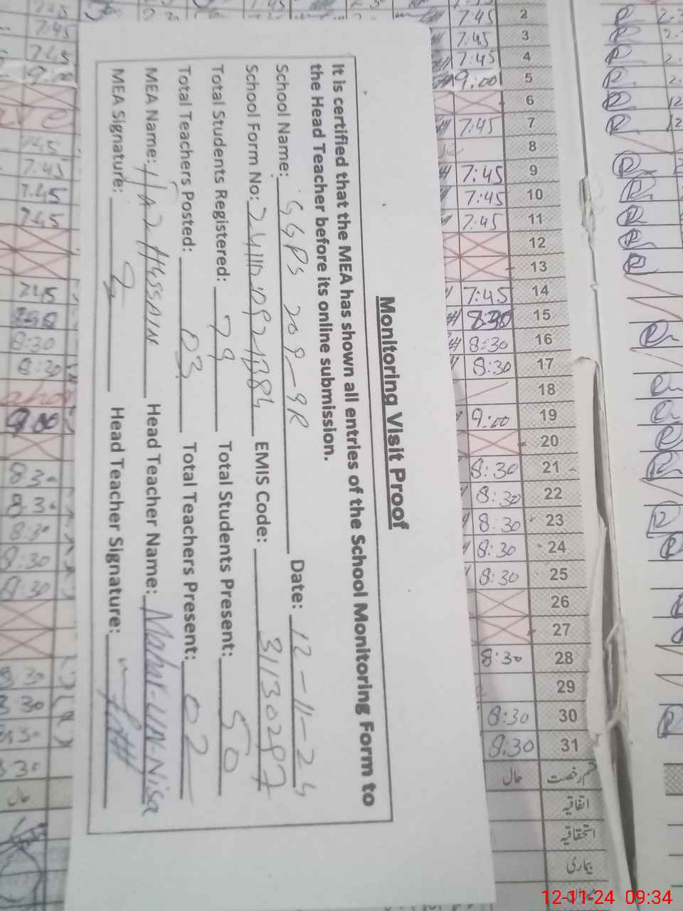 | Attendance Register | Head Teacher | MEA with School | Visit Proof |