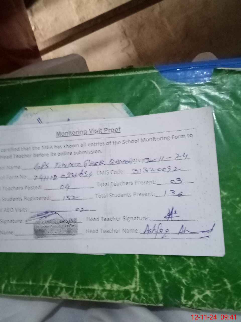 | Attendance Register | Head Teacher | MEA with School | Visit Proof |