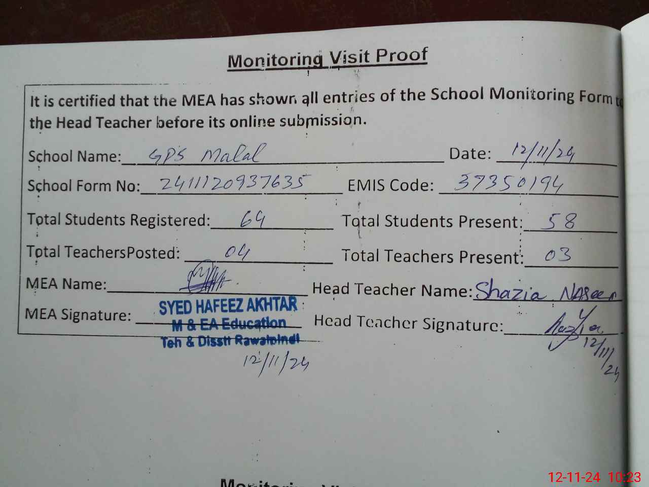 | Attendance Register | Head Teacher | MEA with School | Visit Proof |