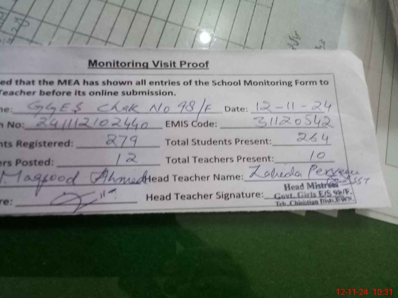 | Attendance Register | Head Teacher | MEA with School | Visit Proof |
