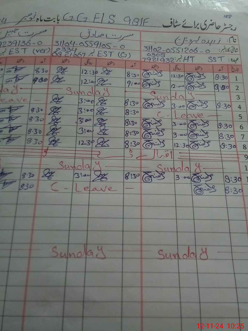 | CNIC | Full Name | Designation | R/C | Absence during last cal. month |