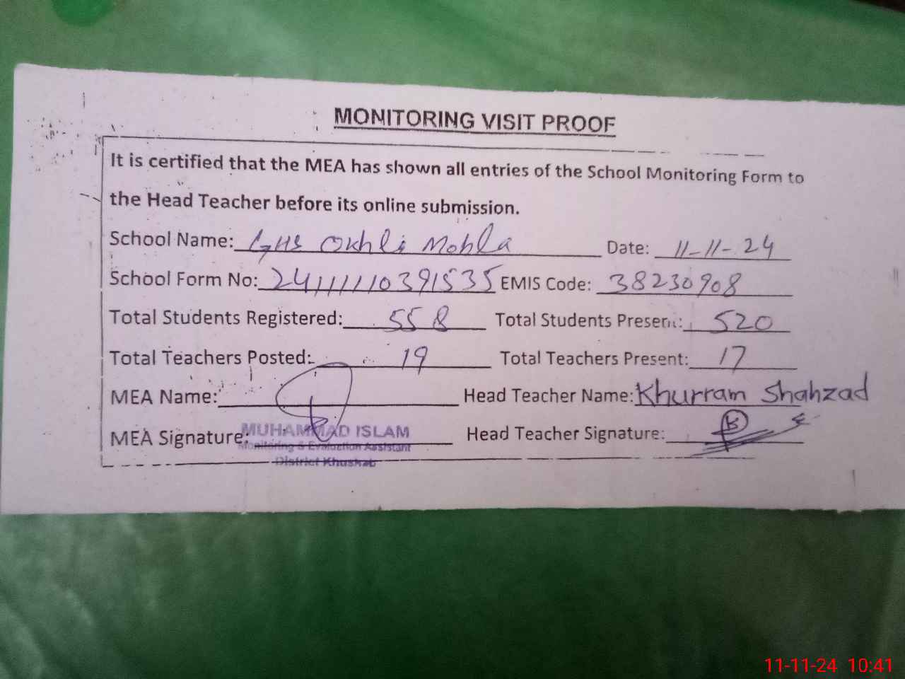 | Attendance Register | Head Teacher | MEA with School | Visit Proof |