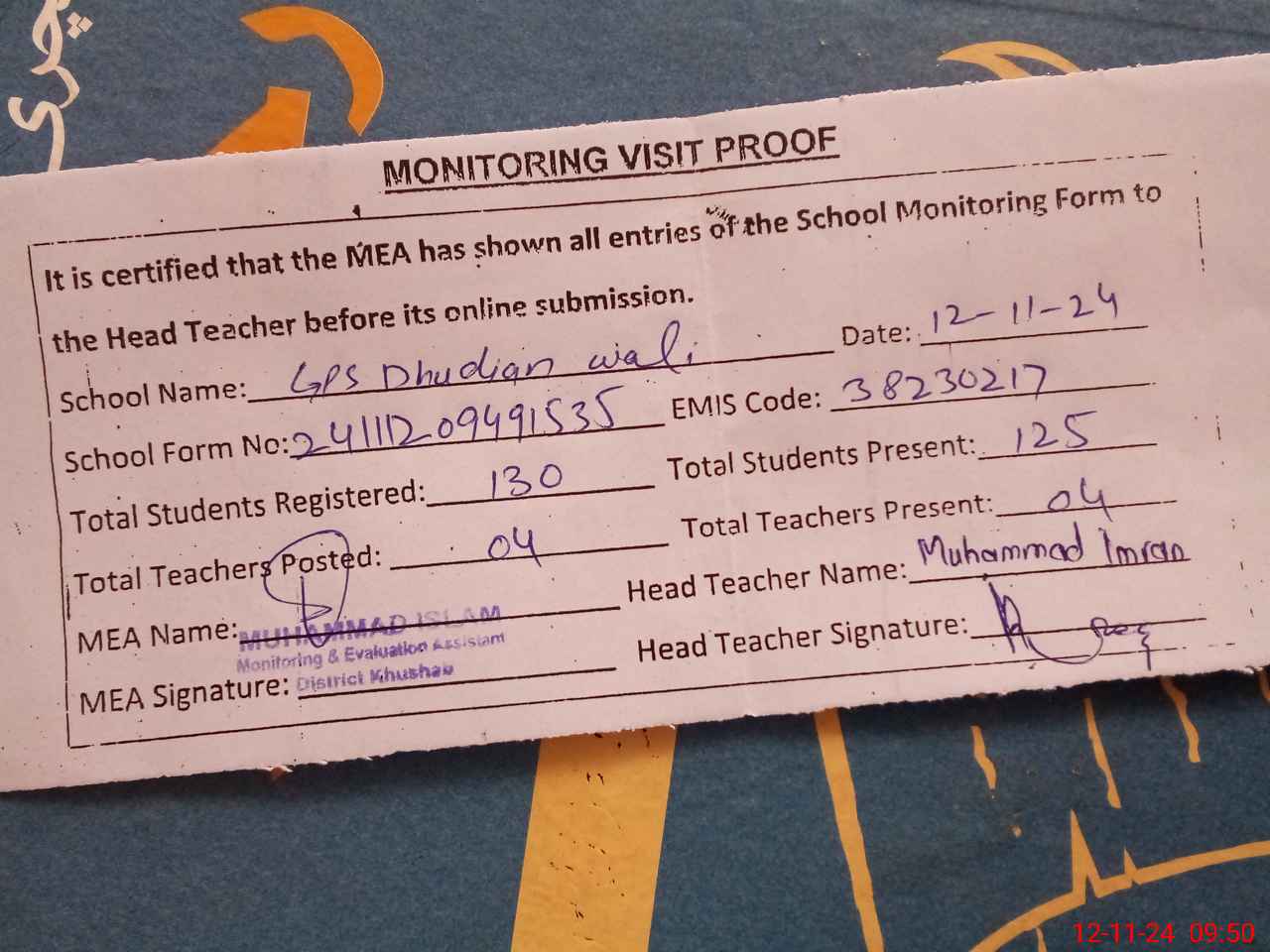 | EMIS Code: 38230217 | Name of School: GPS DHUDIAN WALI | |||