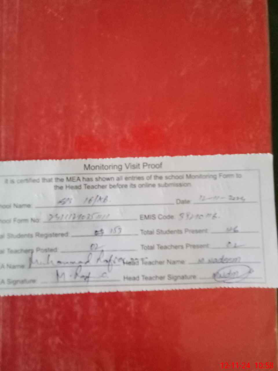| Attendance Register | Head Teacher | MEA with School | Visit Proof |