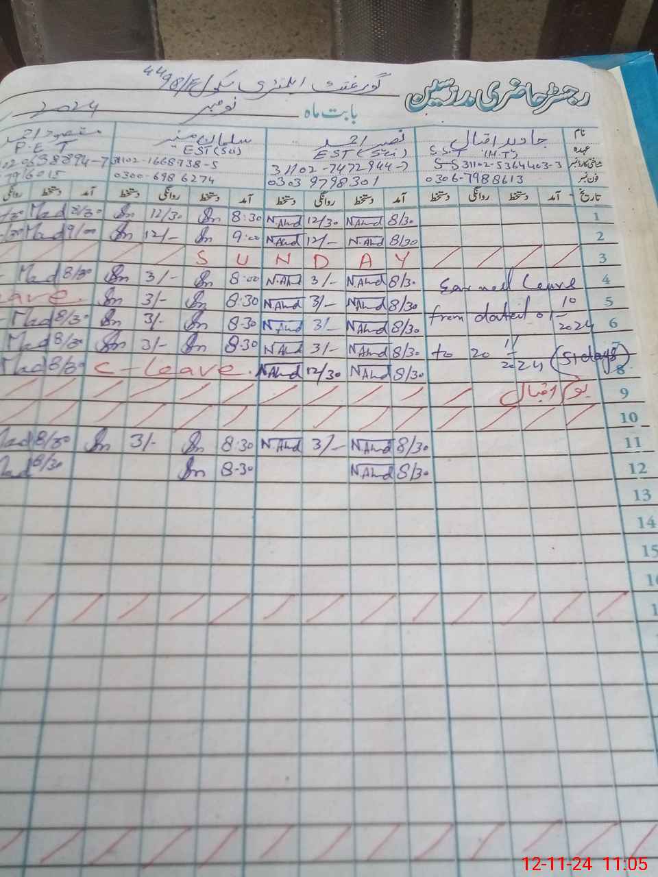 | CNIC | Full Name | Designation | R/C | Absence During Last Calender Month |
