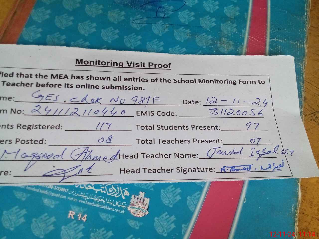 | Attendance Register | Head Teacher | MEA with School | Visit Proof |