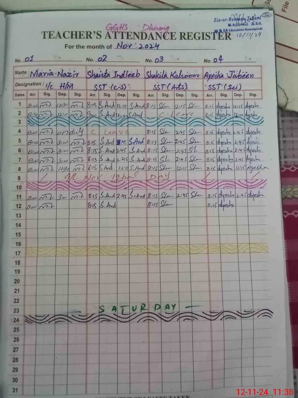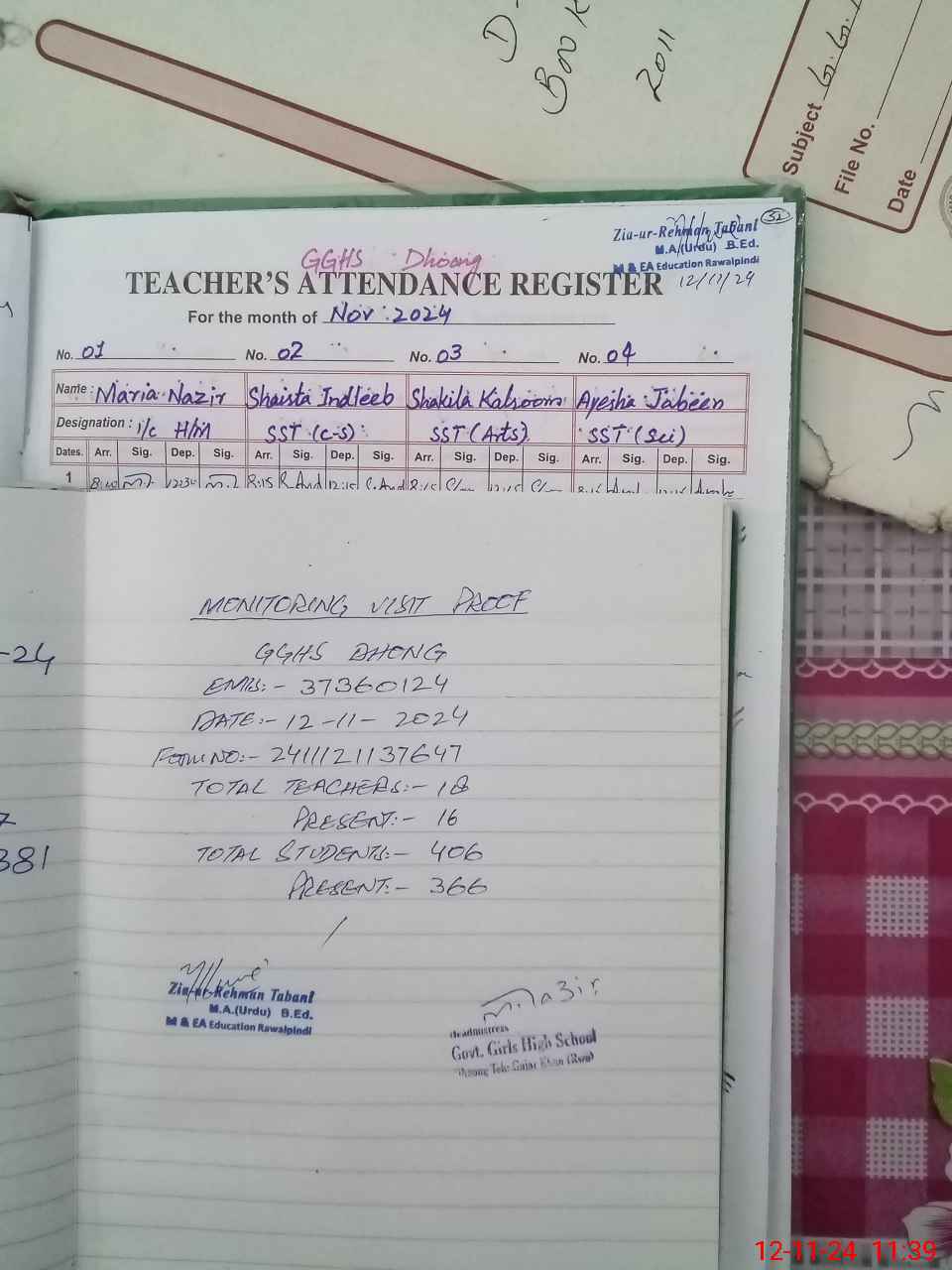 | Remarks (Use Separate Page if Required): Teacher Nahid Anjum Pst shown on medical leave but approved medical leave or any other evidence of medical leave is not presented so according to SOP considered as Unauthorized ABSENT Teacher Hifza Ibrar est Unauthorized ABSENT since 16 Feb 2024 still no disciplinary action taken against her | |||||