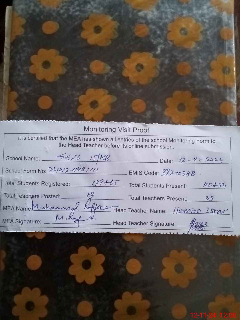 | Attendance Register | Head Teacher | MEA with School | Visit Proof |
