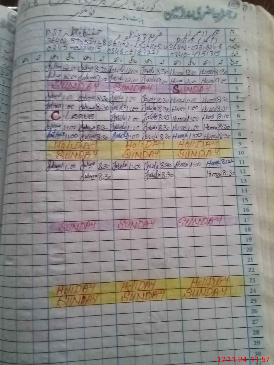 | CNIC | Full Name | Designation | R/C | Absence During Last Calender Month |