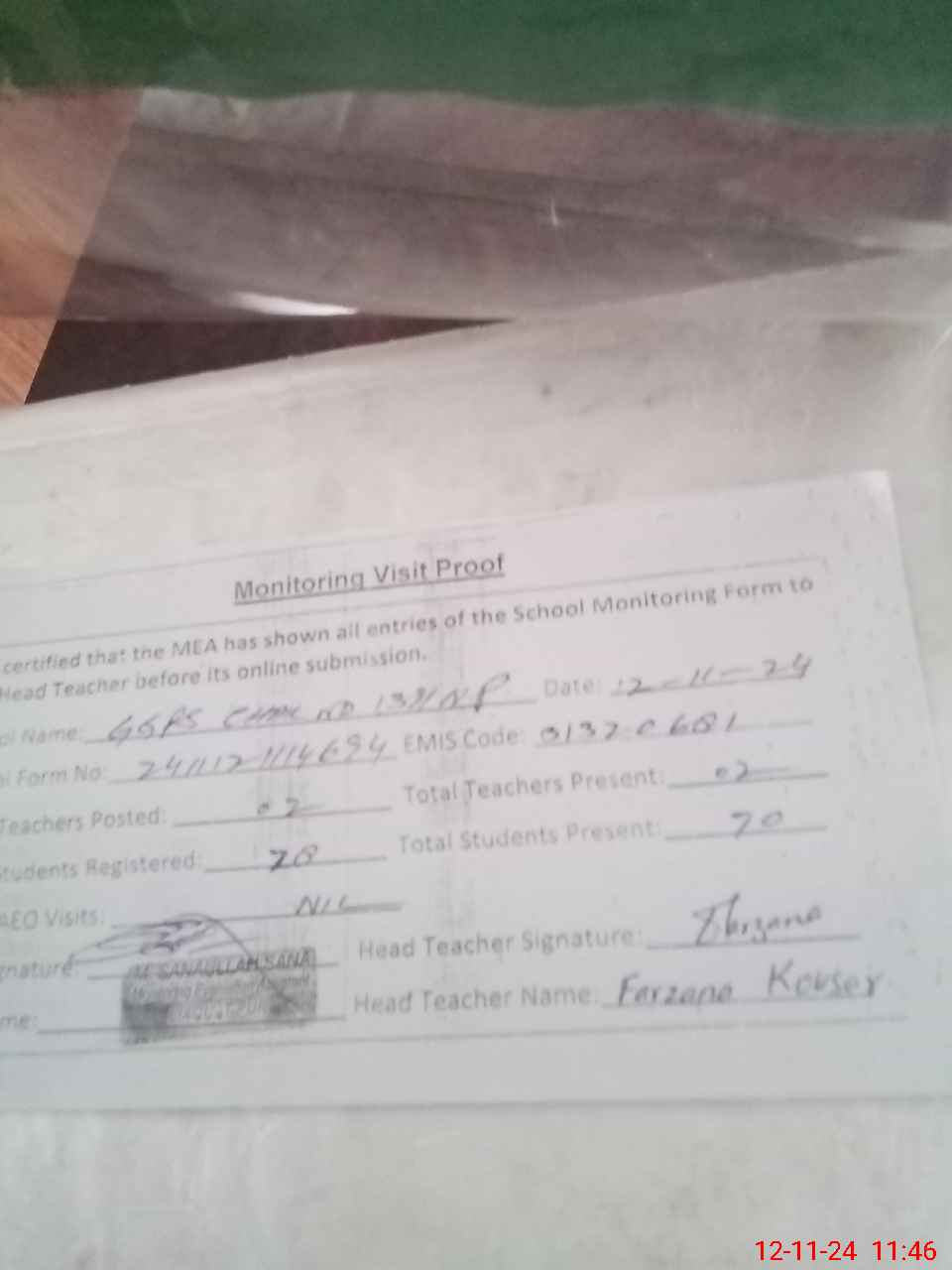 | Attendance Register | Head Teacher | MEA with School | Visit Proof |