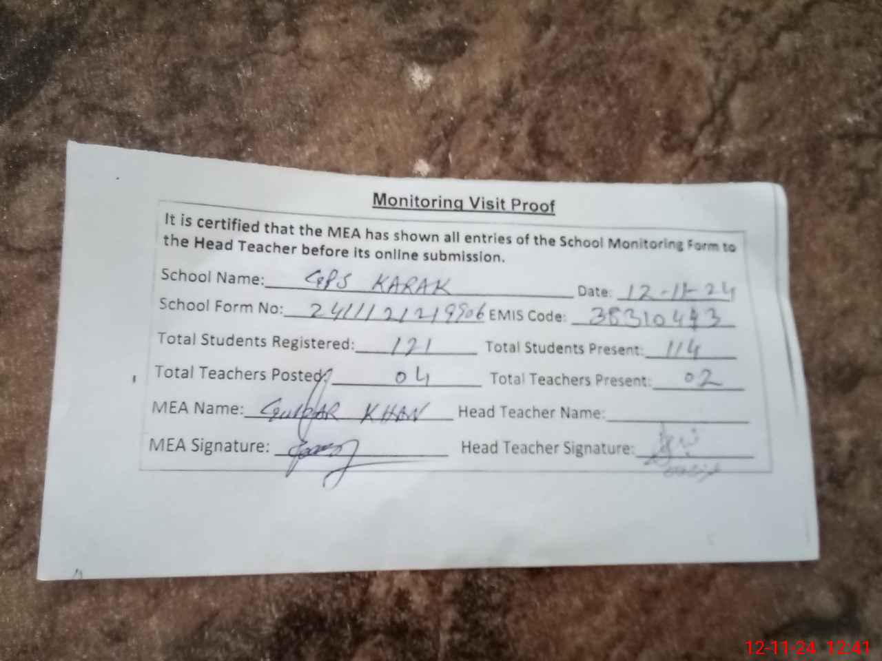 | Attendance Register | Head Teacher | MEA with School | Visit Proof |