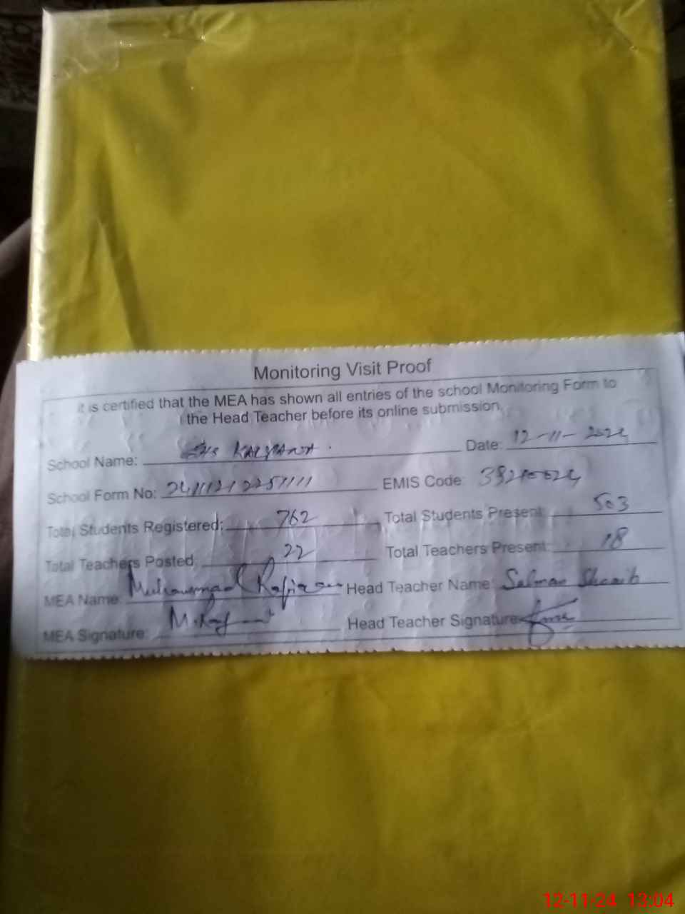 | Attendance Register | Head Teacher | MEA with School | Visit Proof |