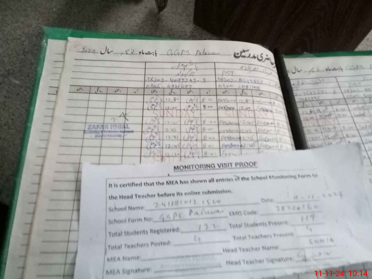 | Monitoring Date: 11-11-2024 | Start Time: 11-11-2024 09:55 AM | End Time: 11-11-2024 10:16 AM | Name of MEA: ZA**** IQ**** | |