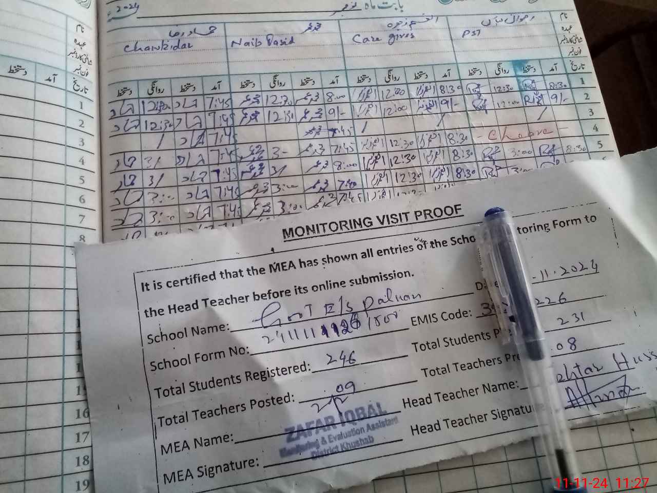 | Attendance Register | Head Teacher | MEA with School | Visit Proof |