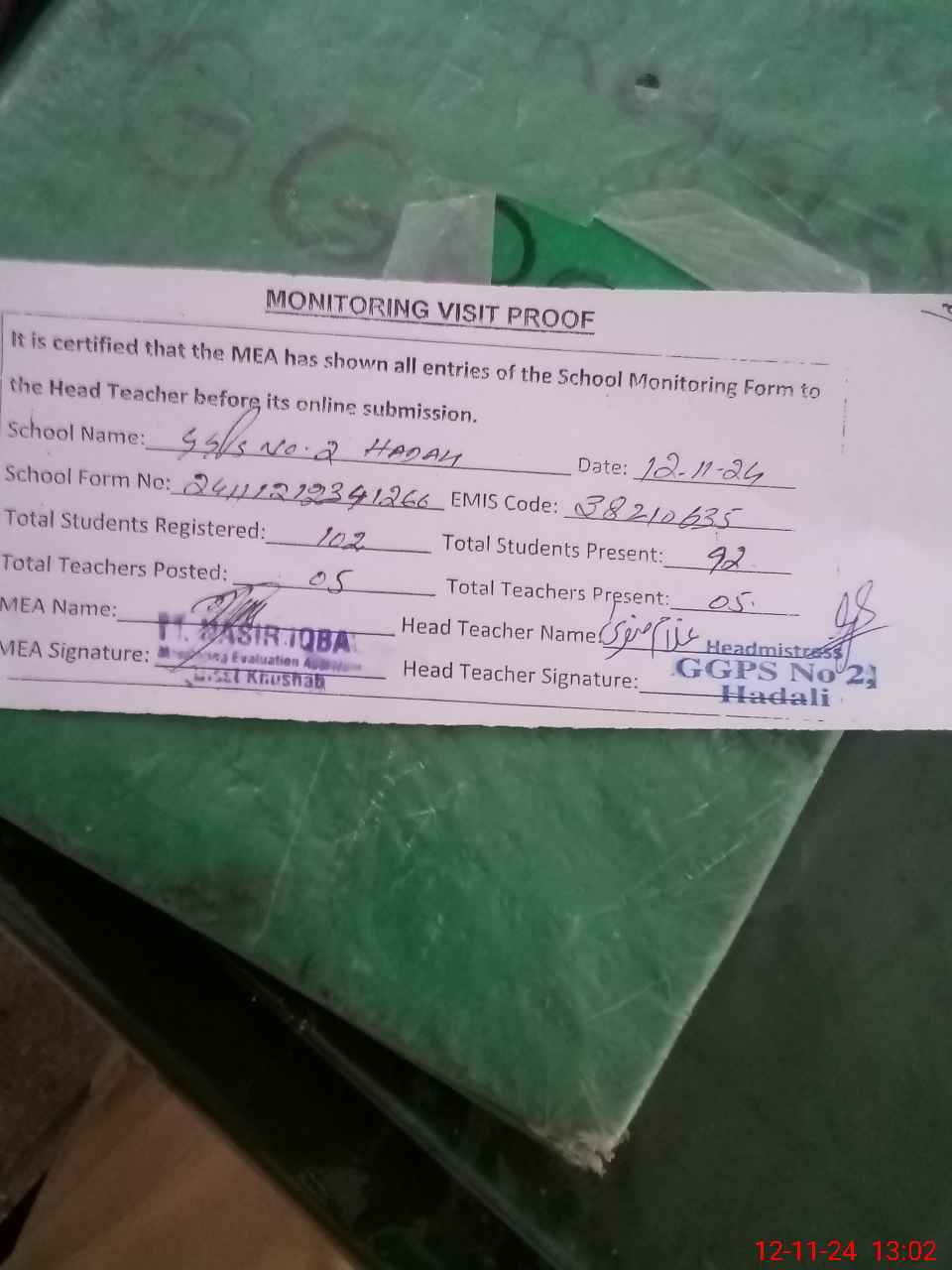 | EMIS Code: 38210635 | Name of School: GGPS NO. 2 HADALI | |||
