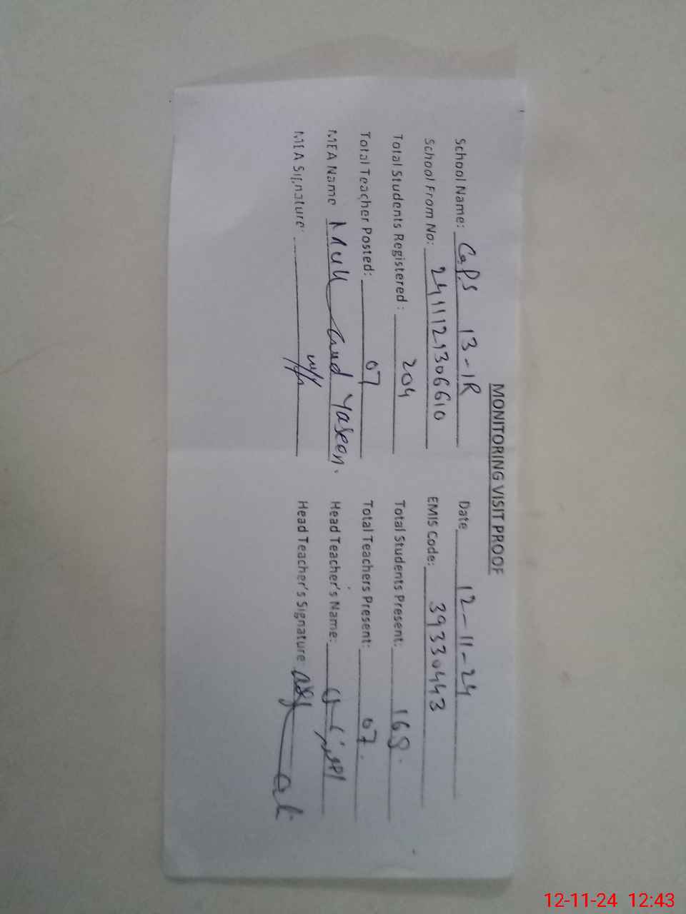 | Attendance Register | Head Teacher | MEA with School | Visit Proof |