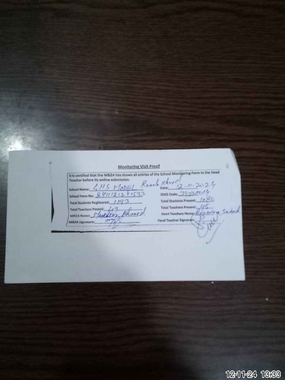 | Attendance Register | Head Teacher | MEA with School | Visit Proof |