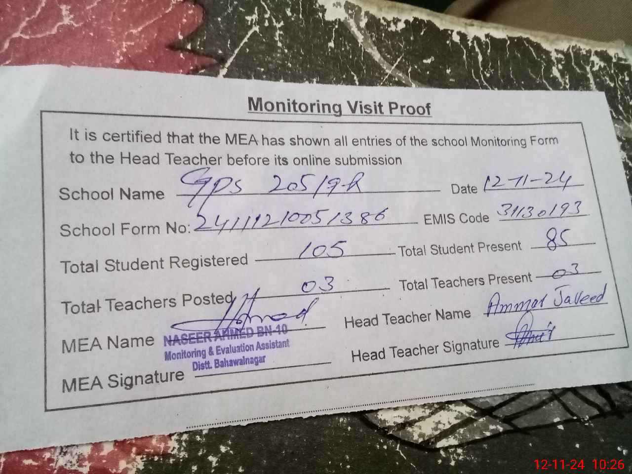 | Attendance Register | Head Teacher | MEA with School | Visit Proof |