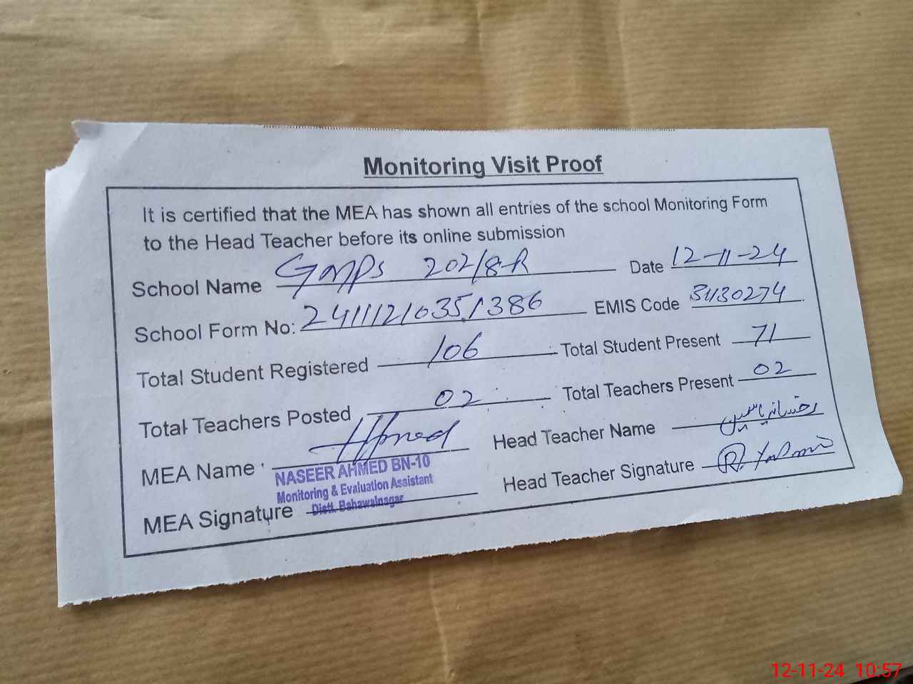 | EMIS Code: 31130274 | Name of School: GMPS CHAK NO 202/8-R EAST | |||