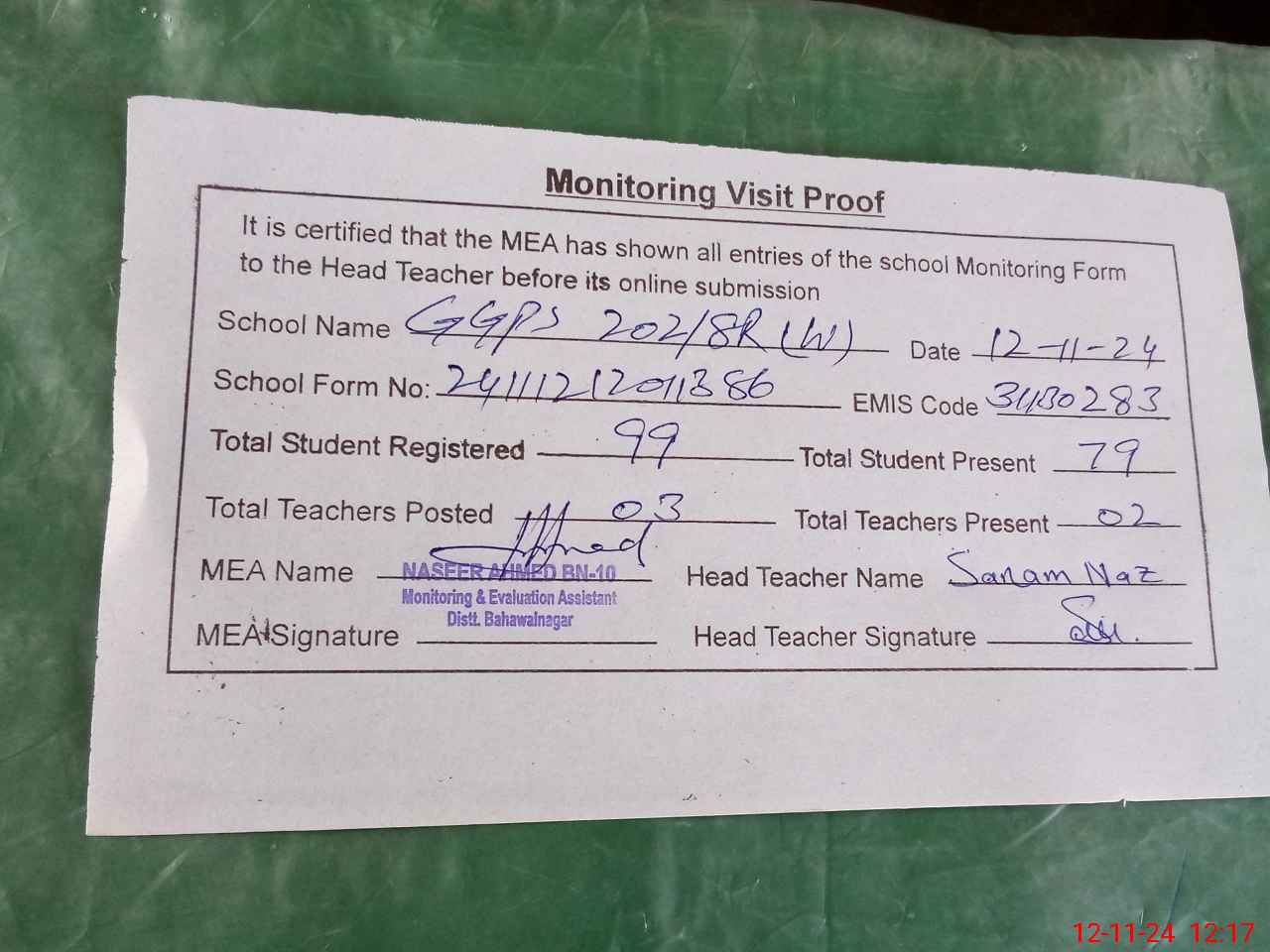 | EMIS Code: 31130283 | Name of School: GGPS CHAK NO 202/8-R WEST | |||