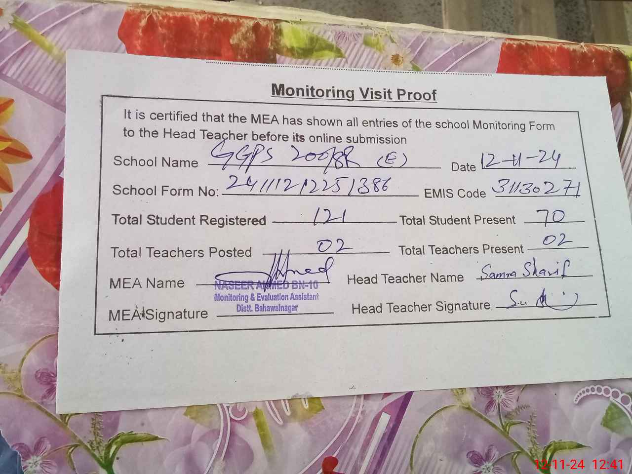 | EMIS Code: 31130271 | Name of School: GGPS CHAK NO 200/8-R EAST | |||
