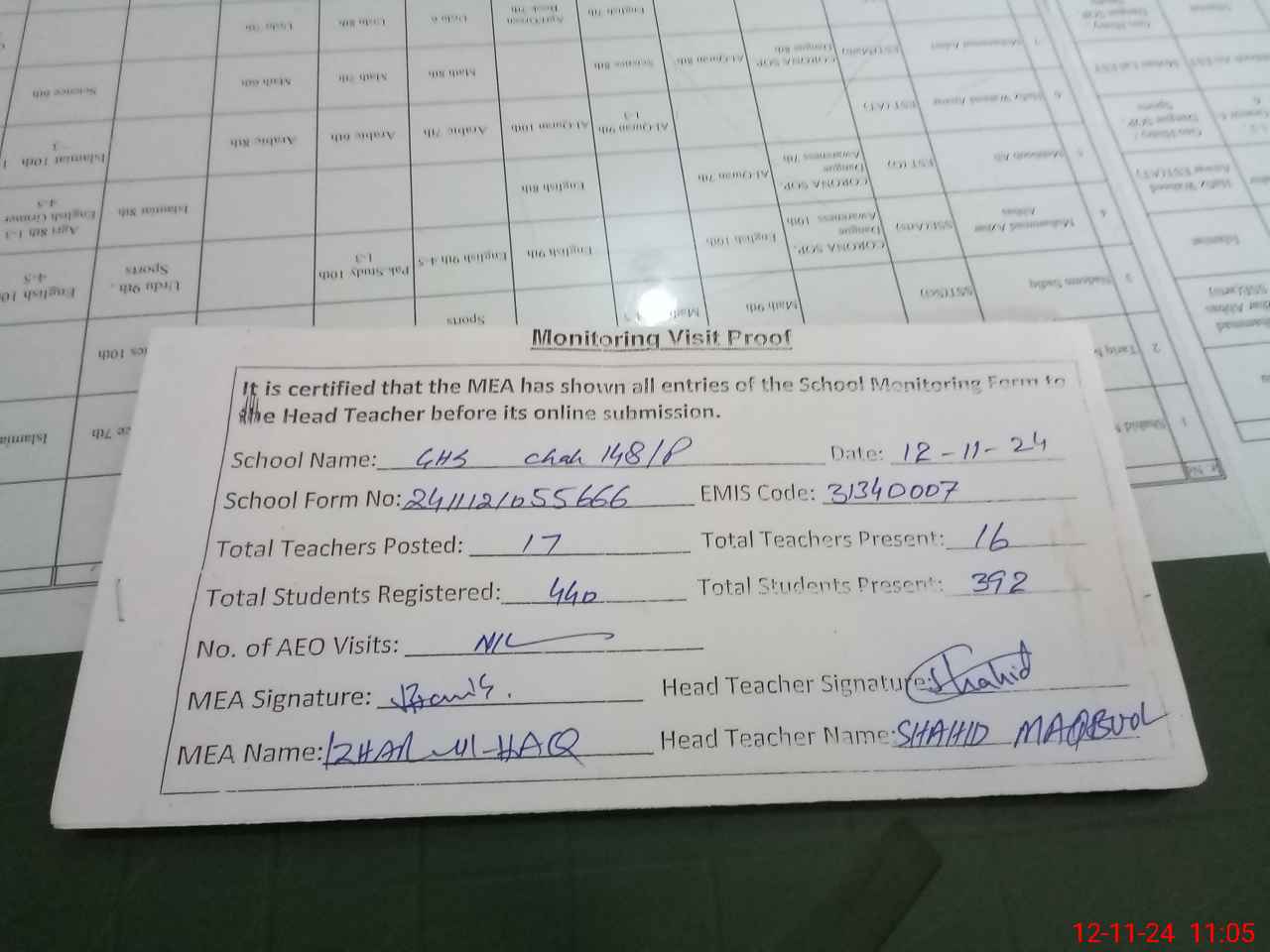 | Monitoring Date: 12-11-2024 | Start Time: 12-11-2024 10:13 AM | End Time: 12-11-2024 11:06 AM | Name of MEA: Mu**** Iz**** UlHa**** | |