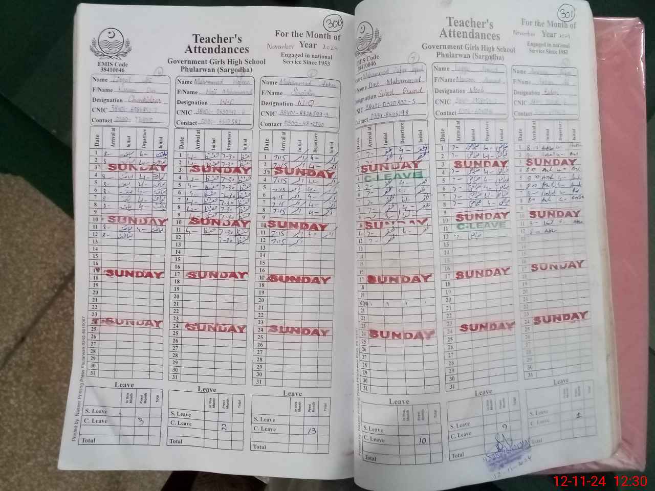 | CNIC | Full Name | Designation | R/C | Absence During Last Calender Month |