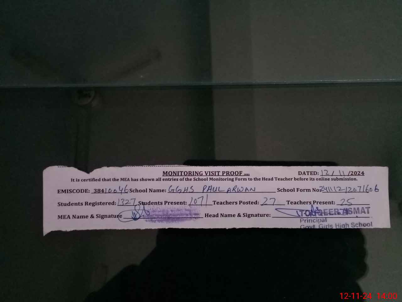 | Monitoring Date: 12-11-2024 | Start Time: 12-11-2024 12:07 PM | End Time: 12-11-2024 02:00 PM | Name of MEA: HA**** SA**** AH**** | |