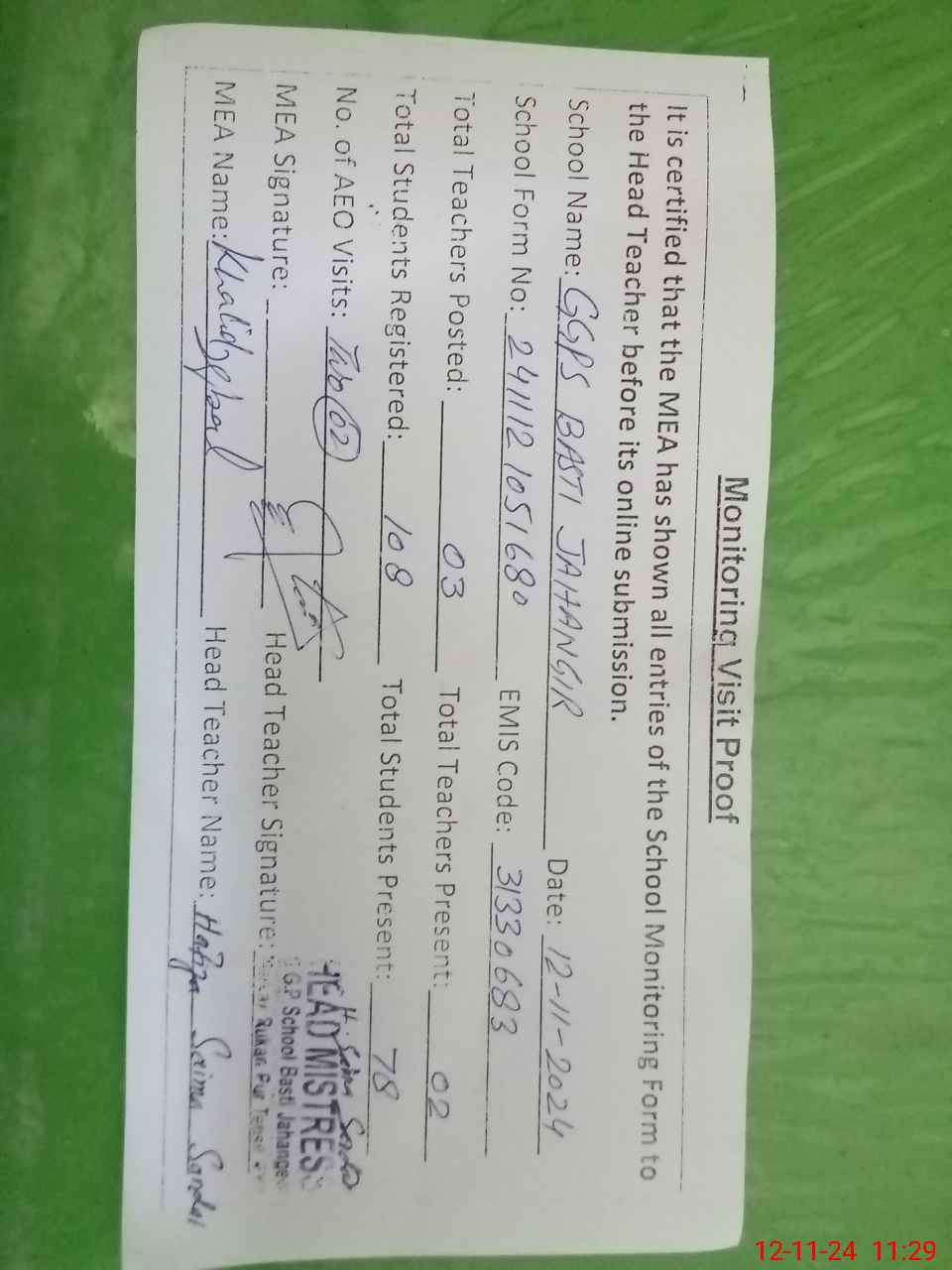 | Attendance Register | Head Teacher | MEA with School | Visit Proof |