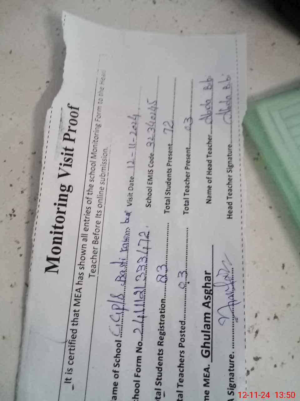 | Attendance Register | Head Teacher | MEA with School | Visit Proof |