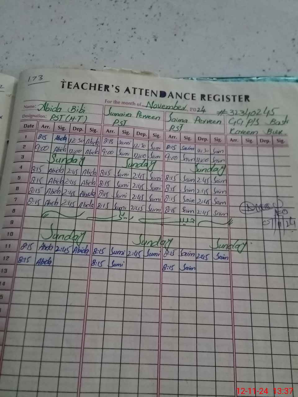 | Name: AB**** BI**** Designation: (School Headmaster's/Headmistress's) PST Phone/Cell Number: 03**** |
