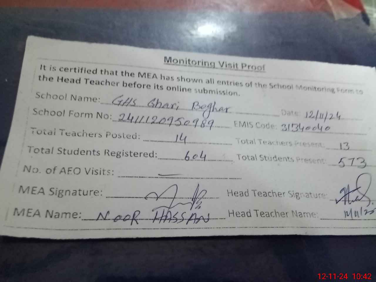 | EMIS Code: 31340040 | Name of School: GHS GHARI BHGER | |||