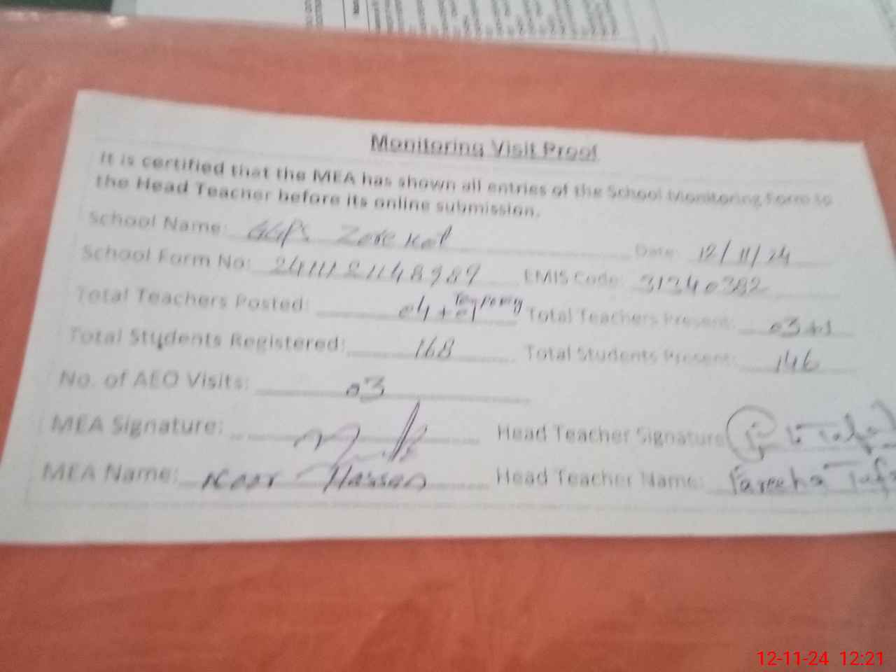 | Attendance Register | Head Teacher | MEA with School | Visit Proof |