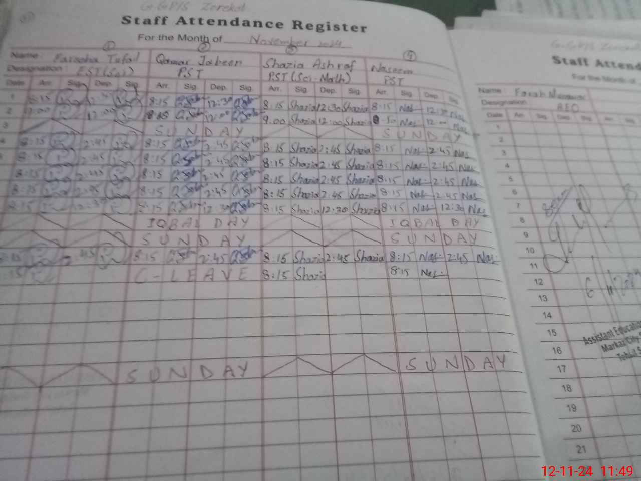| Remarks (Use Separate Page if Required): Sana Ramzan pst Temporary bound In this school Sis not working Students attendance according to attendance register | |||||