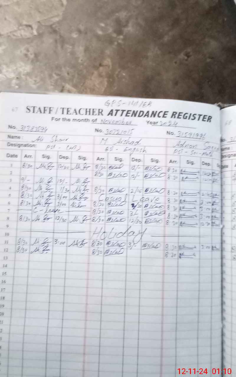 | Name: AL**** SH**** Designation: (School Headmaster's/Headmistress's) PST Phone/Cell Number: 03**** |
