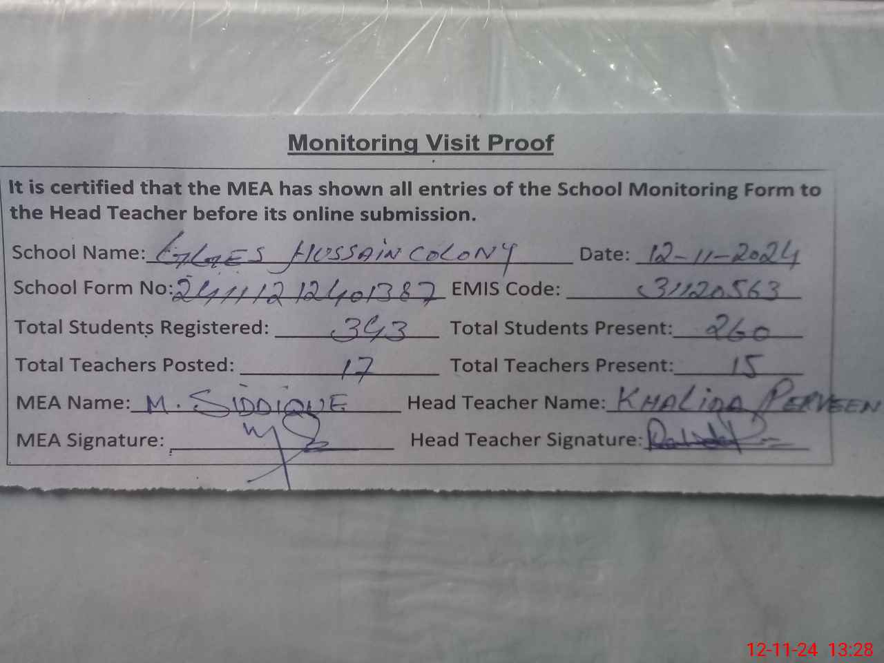 | Attendance Register | Head Teacher | MEA with School | Visit Proof |