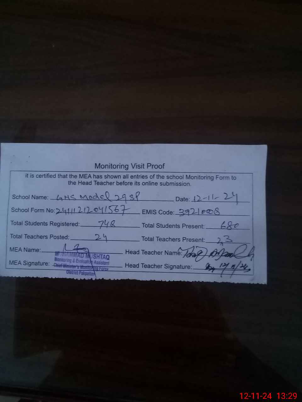 | EMIS Code: 39210008 | Name of School: GHS MODEL 29/SP PAKPATAN | |||