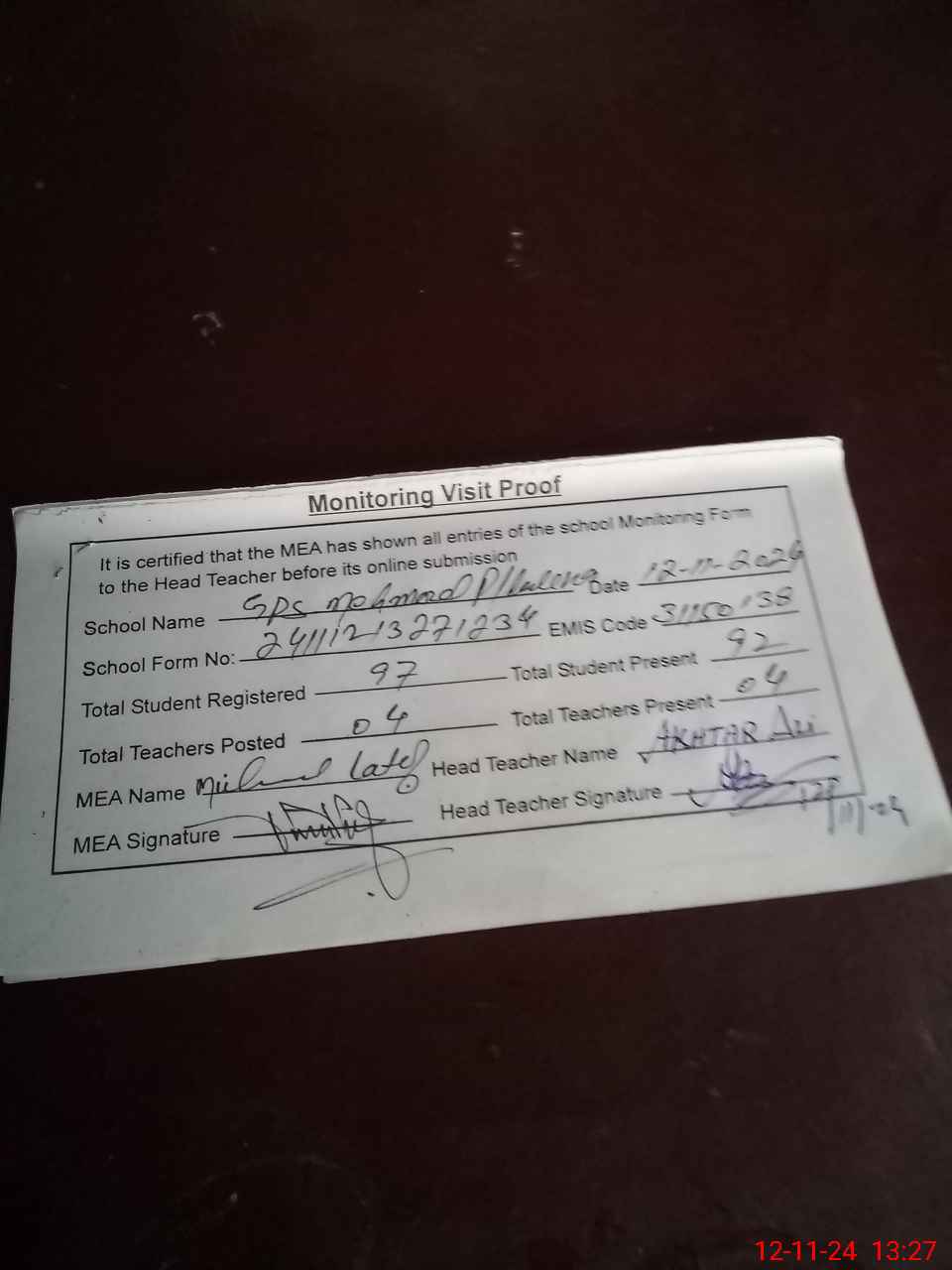 | Attendance Register | Head Teacher | MEA with School | Visit Proof |