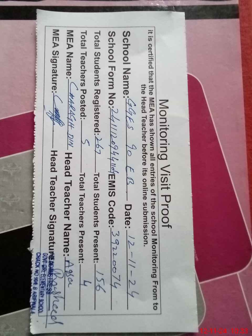 | Attendance Register | Head Teacher | MEA with School | Visit Proof |