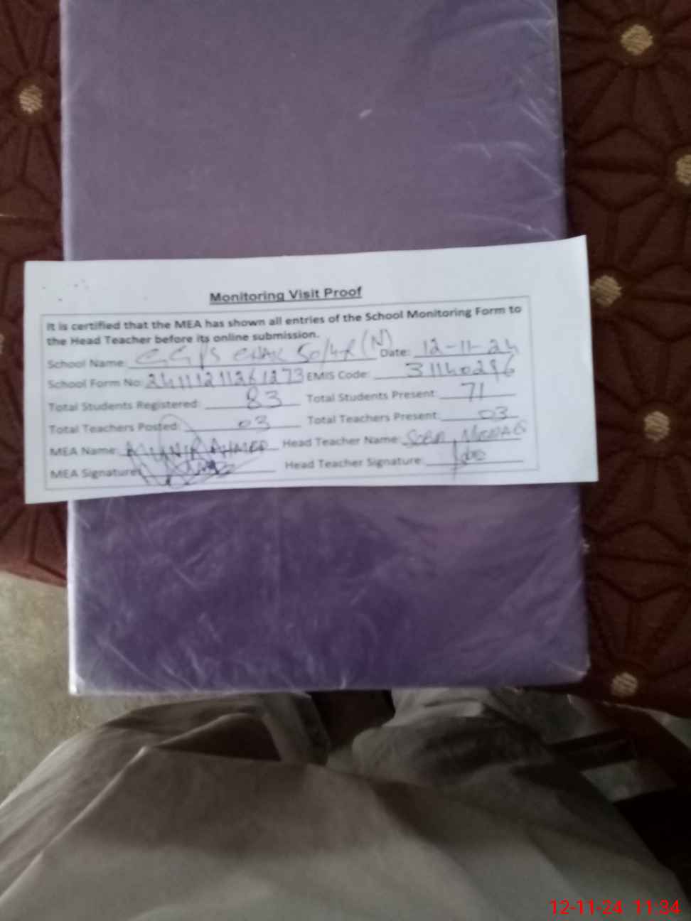 | Attendance Register | Head Teacher | MEA with School | Visit Proof |