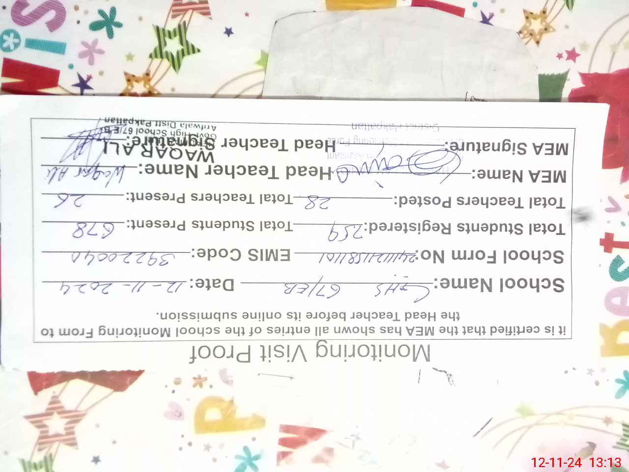 | Monitoring Date: 12-11-2024 | Start Time: 12-11-2024 11:53 AM | End Time: 12-11-2024 01:14 PM | Name of MEA: Ha**** Ul**** Ur**** Ba**** Al**** | |