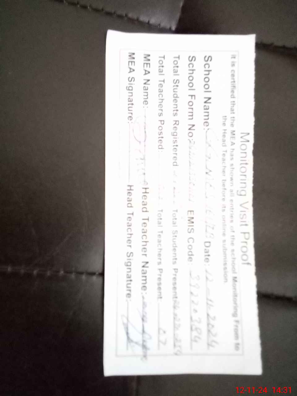 | Attendance Register | Head Teacher | MEA with School | Visit Proof |