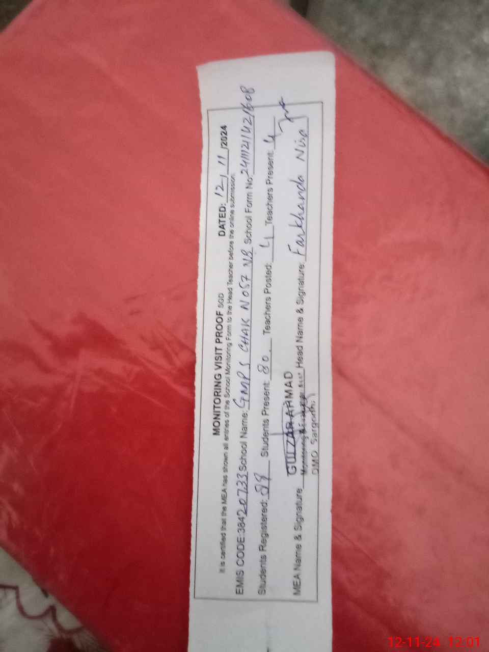 | Attendance Register | Head Teacher | MEA with School | Visit Proof |