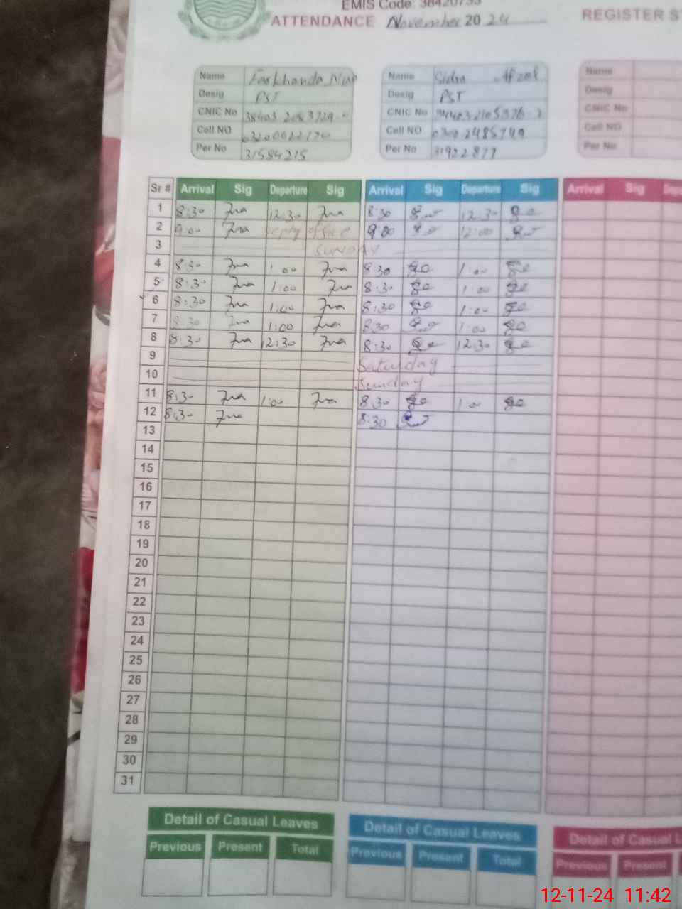| CNIC | Full Name | Designation | R/C | Absence During Last Calender Month |