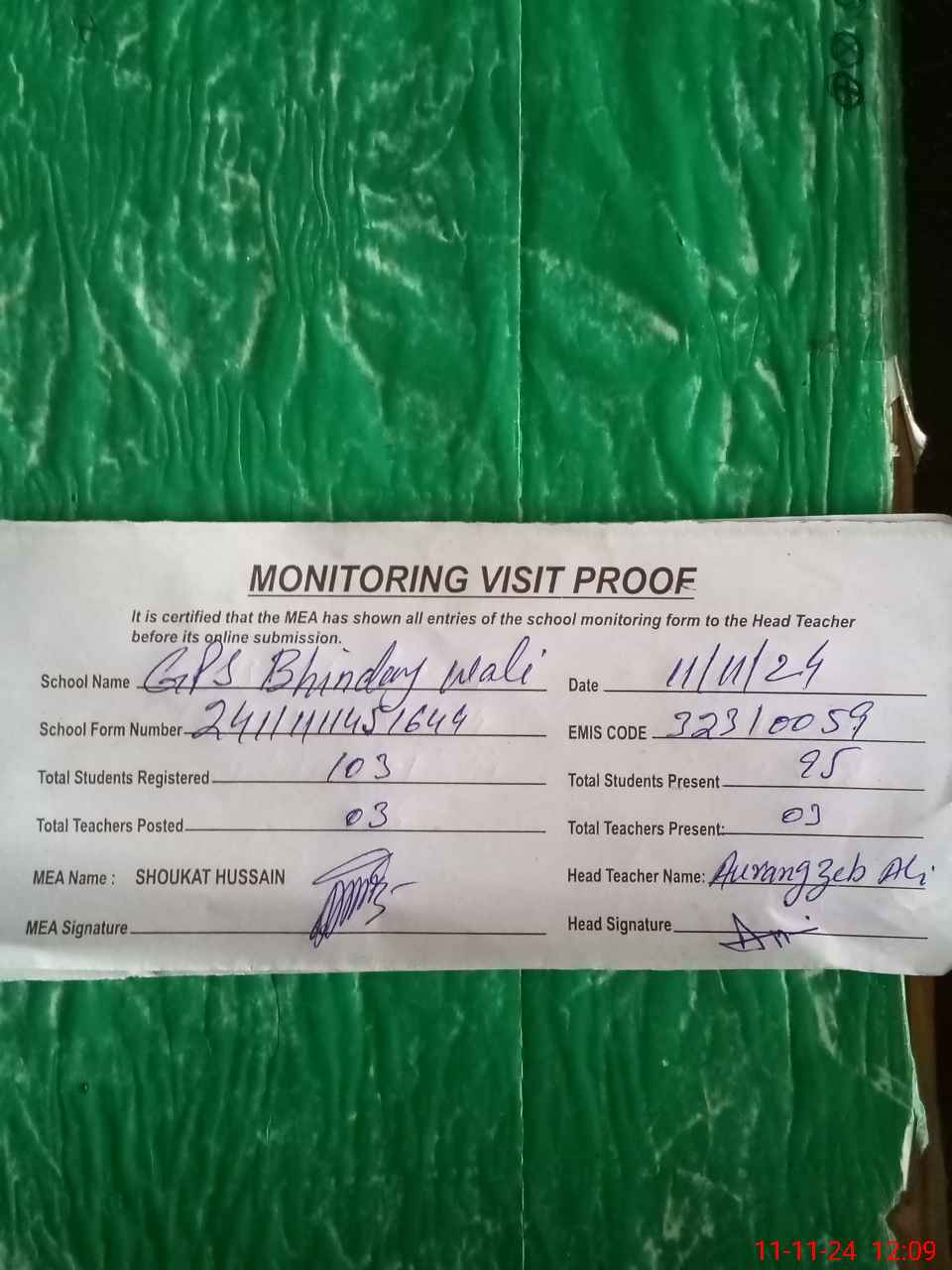 | Attendance Register | Head Teacher | MEA with School | Visit Proof |