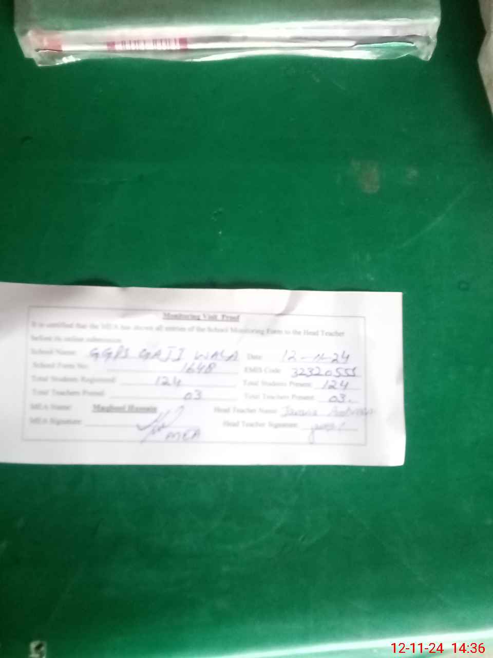 | Attendance Register | Head Teacher | MEA with School | Visit Proof |