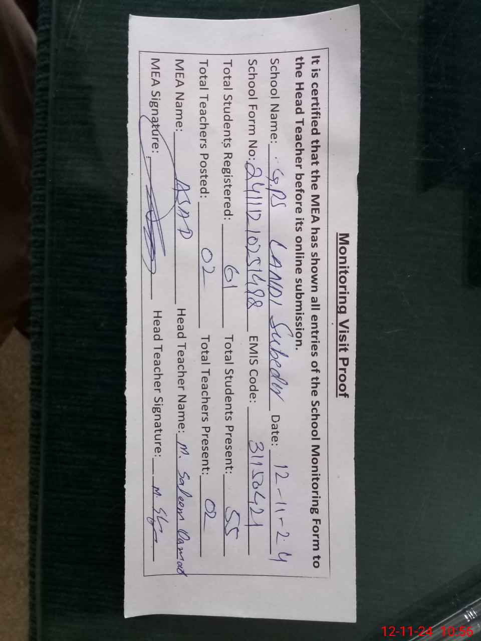 | Attendance Register | Head Teacher | MEA with School | Visit Proof |